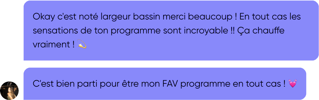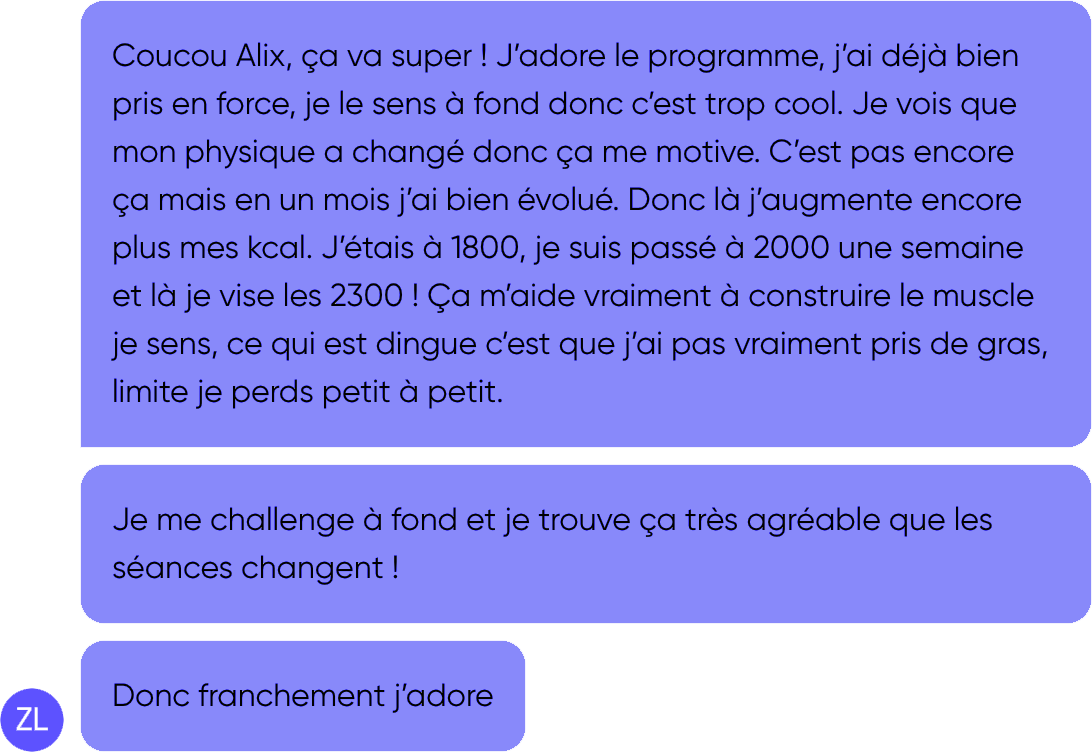 Tu n’es jamais seule, je suis disponible 5j/7j directement dans le chat de l'application où tu peux me poser tes questions, je réponds par écrit et par voice (le plus souvent d'ailleurs). A chaque fin d'entrainement tu peux me faire un retour sur cette séance spécifiquement. Si tu as peur de mal exécuter tes mouvements tu peux m'envoyer des videos pour que je puisse te corrige. Et enfin je peux t'aider à adapter tes séances si besoin. Je suis là pour t’accompagner tout au long de ces 12 semaines, t’épauler et te guider à chaque étape, afin que tu puisses avancer en toute confiance.